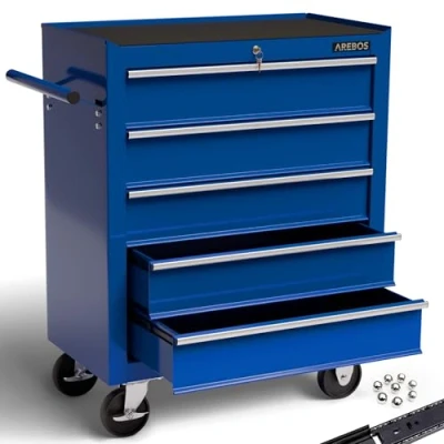 Arebos Workshop trolley 5 compartments Tool Cabinet on Wheels Chest with Drawers Lockable incl. anti slip mats 2 castors parking brake (blue)