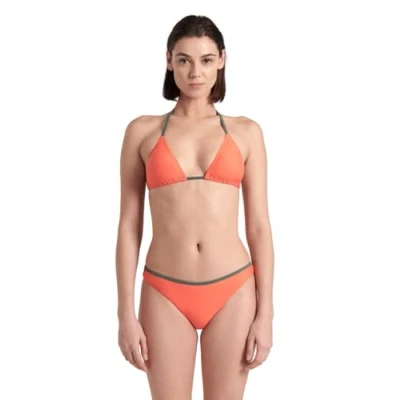Sports-inspired women's bikini that celebrates arena's DNA and iconic styles. Designed for lovers of an athletic look and made with a perfect fit so you can enjoy every movement in and by the water. Extra soft, stretchy and quick-drying fabric for premium comfort Top with removable cups and ties for a customized fit. Brazilian briefs with 3.5 cm side length. Fully lined for total coverage. This product has the MADE IN GREEN by OEKO-TEX label. Ideal for swimming, leisure and sports activities at the beach and in the pool 87% Polyamide, 13% Elastane (eco-friendly fabric: 100% of Polyamide is recycled)