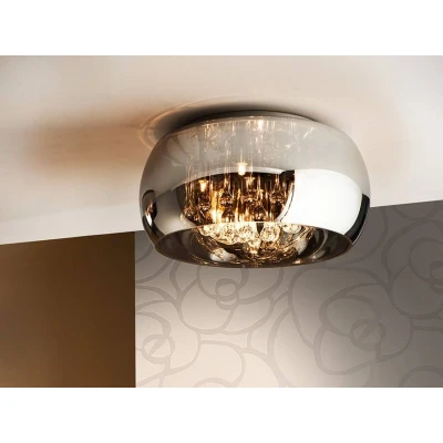 Ceiling lamp made of metal chromed finish. Shimmered glass shade. Crystal drops inside, Murano style. DIMMABLE. Remote control included.