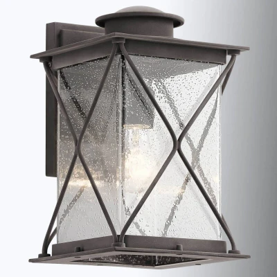 Large lantern-shaped Argyle outdoor wall lamp The design and colour of the Argyle outdoor wall lamp makes it perfect for use in combination with a rustic country property design style. The beautiful lantern emits very inviting light through its clear slightly patterned glass lampshade, which creates a cosy atmosphere in the area. The weathered zinc look of the finish of the metal frame’s surface looks very authentic and also helps the wall lantern to suit older walls perfectly. The crossed metal bars, which serve as protection for the glass,also look very rustic.