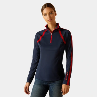 Ariat Womens Sunstopper 3.0 1/4 Zip Base Layer Navy/Red. The Ariat Womens Sunstopper 3.0 1/4 Zip Base Layer is a must have in your summer wardrobe! The Womens Sunstopper 3.0 has been designed to include many of Ariats Technical properties ensuring you stay comfortable and protected when it warms up. In this Base Layer is, AriatTEK which is designed for optimal comfort in any weather, ClimateTEK which dynamically responds to your body temperature to keep you cool when things heat up, FreshTEK giving you sustainable odour-resistance, Moisture Movement Technology to help keep you dry wicking moisture away from your skin and it is crafted from a soft Sun Protection Fabric giving you UV coverage. This Base Layer also features a mock collar with a 1/4 zip and mesh panelling including mesh on each underarm for maximum breathability without sacrificing the coverage you need on warm, sunny days. Specification: UPF 50+. Fabric & Care: 94% Recycled Polyester, 6% Elastane. Lightweight recycled polyester/elastane blend pique knit.