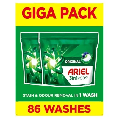 POWERFUL CLEANING: Ariel 3in1 Original Pods deliver exceptional stain removal performance, tackling tough marks and dirt in just one wash cycle CONVENIENT CAPSULES: Pre-measured detergent capsules eliminate guesswork and provide the perfect amount of cleaning power for each laundry load LONG-LASTING FRESHNESS: Infused with Silk Tree Blossom scent that keeps your clothes smelling wonderfully fresh long after washing COMPLETE SOLUTION: 3-in-1 formula combines cleaning power, stain removal capabilities, and fabric freshening technology in one convenient pod ECONOMICAL PACK: Large 86-count package provides nearly three months of laundry cleaning for regular household use