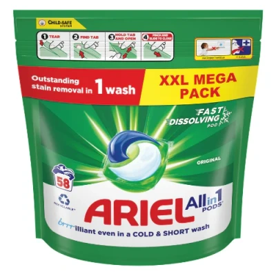 FabFindsGet outstanding stain removal and long-lasting freshness with Ariel All-in-1 Original Pods. This pack of 58 pods delivers deep cleaning, fabric care, and a crisp clean scent—all in one convenient dose.. 58 pre-measured All-in-1 laundry pods for everyday washing. Powerful cleaning with Ariel’s deep fibre technology. Removes tough stains, even in cold water. Original fresh scent leaves clothes smelling clean and vibrant. Easy-to-use pods dissolve completely with no residue
