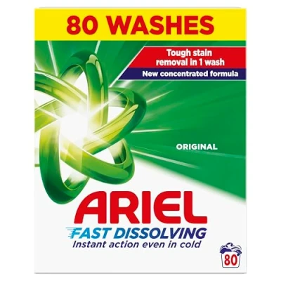 Ariel Fast Dissolving Washing Powder Laundry Detergent 4kg, 80 Washes, Original, Tough Stain Removal In 1 Wash, Instant Action Even Cold