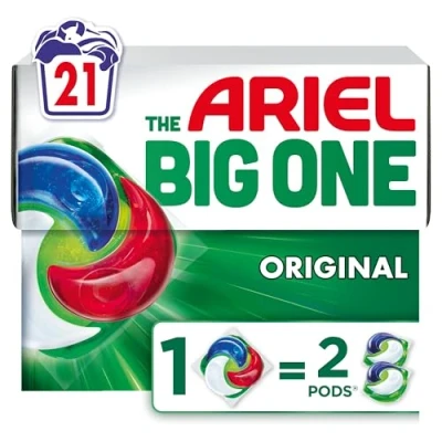 2X STAIN and ODOUR REMOVAL: Ariel The Big One washing capsules are packed with 2X stain and odour removal (the performance of Ariel The Big One equals 2 Ariel Original 3in1 PODS) OUR MAXIMUM CLEAN FOR MINIMUM EFFORT: Ariel The Big One Original washing capsules give you the maximum Ariel clean for minimum effort; with built-in pre-treat, you can forget re-wash, even in your fullest and toughest loads FAST DISSOLVING EVEN IN COLD: Ariel The Big One washing PODS dissolve fast even in cold water WASH COLDER and save up to 60Percent on your washing machine electricity bill (washing machine energy consumption from 40°C to 20°C, normal cycle) HOW TO USE THE BIG ONE FOR BEST RESULTS: Pod first, laundry on top to remove tough stains even in cold