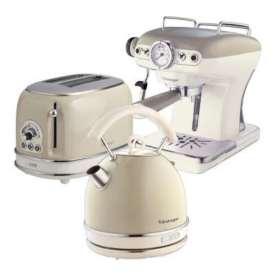 The Ariete ARPK16 Vintage trio combines a classic design aesthetic with modern functionality, making it an essential kitchen set for the contemporary home. This stylish bundle includes a 2-slice TOASTER, a 1.7L DOME KETTLE, and an ESPRESSO COFFEE MAKER, all presented in a beautiful cream finish that adds a nostalgic touch to any kitchen decor.