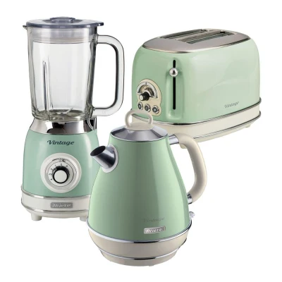 Get everything you need. This Ariete bundle includes a 2-slice toaster, a kettle and a blender in the same retro design so you can add a touch of vintage style to your kitchen.___________________________________________________________________________Ariete Vintage 155 2-Slice Toaster - Green- 6 browning levels let you decide how crunchy you want your toast- You can easily defrost frozen bread or reheat cold slices- With a removable crumb tray, it's easy to keep your worktop clean and tidy___________________________________________________________________________ARIETE Vintage 2869 Jug Kettle - Green- Prepare hot drinks for your whole family with the 1.7-litre capacity- The 360° base makes the kettle easy to use whether you're left- or right-handed- The removable filter keeps limescale out of your drinks, so you can enjoy better-tasting tea and coffee- Safety features like the cool-touch housing and auto switch-off will give you extra peace of mind___________________________________________________________________________Ariete Vintage 583 Blender - Green- Choose between 4 speed settings and a pulse function to blend fruit and veg, and even crush ice- With the 1.5-litre glass jug, you can make refreshing cocktails or creamy milkshakes for your whole family- The non-slip feet keep everything steady while you're blending