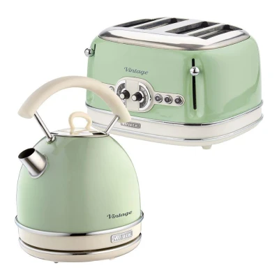 Ariete ARPK40 Retro Style Dome Kettle and 4 Slice Toaster Set, Vintage Design, Green, Stainless Steel