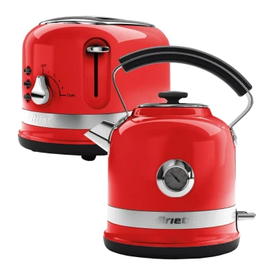 Get everything you need to prepare a tasty breakfast. This Ariete bundle includes a 2-slice toaster and a kettle, so you can enjoy coffee and crunchy toast first thing in the morning. ___________________________________________________________________________Ariete Moderna AR1491 2-Slice Toaster - Red- Customise your toast to your own taste preferences with 6 browning levels to choose from- Self centering slots keep your toast in place for the perfect evenly cooked slices- Easy to use defrost and reheat buttons give you full control- The removable crumb tray helps to make sure your kitchen worktop stays clean___________________________________________________________________________Ariete Moderna 2854 Traditional Kettle - Red- Thanks to the external thermometer you can easily read the water temperature- Prepare hot drinks for the whole family with the 1.7-litre capacity- Fully rotating base makes the kettle perfectly suited for left or right hand use- The automatic shut-off and overheat protection provide safety and peace of mind
