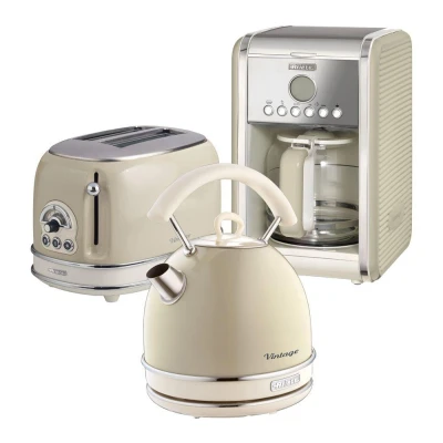 Get everything you need. This Ariete bundle includes a 2-slice toaster, a kettle and a filter coffee machine in the same retro design so you can add a touch of vintage style to your kitchen.___________________________________________________________________________Ariete Vintage 155 2-Slice Toaster - Beige- 6 browning levels let you decide how crunchy you want your toast- You can easily defrost frozen bread or reheat cold slices- With a removable crumb tray, it's easy to keep your worktop clean and tidy___________________________________________________________________________Ariete Vintage 2877 Traditional Kettle - Beige- Prepare hot drinks for your whole family with the 1.7-litre capacity- The 360° base makes the kettle perfect for left- or right-handed use- There's also a removable limescale filter, so you can enjoy better-tasting tea and coffee___________________________________________________________________________Ariete Vintage 1342 Filter Coffee Machine - Beige- The glass jug is large enough for up to 12 cups, so you can serve everyone their morning coffee in one brew- Programmable timer lets you wake up to fresh coffee every morning- Removable and washable filter will save you the hassle of buying and changing paper filters- Keep warm function keeps the coffee as hot as freshly brewed for half hour- Digital display and push buttons for user-friendly operation