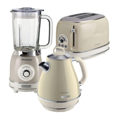 Get everything you need. This Ariete bundle includes a 2-slice toaster, a kettle and a blender in the same retro design so you can add a touch of vintage style to your kitchen.___________________________________________________________________________Ariete Vintage 155 2-Slice Toaster - Beige- 6 browning levels let you decide how crunchy you want your toast- You can easily defrost frozen bread or reheat cold slices- With a removable crumb tray, it's easy to keep your worktop clean and tidy___________________________________________________________________________ARIETE Vintage 2869 Jug Kettle - Beige- Prepare hot drinks for your whole family with the 1.7-litre capacity- The 360° base makes the kettle easy to use whether you're left- or right-handed- The removable filter keeps limescale out of your drinks, so you can enjoy better-tasting tea and coffee- Safety features like the cool-touch housing and auto switch-off will give you extra peace of mind___________________________________________________________________________Ariete Vintage 583 Blender - Beige- Choose between 4 speed settings and a pulse function to blend fruit and veg, and even crush ice- With the 1.5-litre glass jug, you can make refreshing cocktails or creamy milkshakes for your whole family- The non-slip feet keep everything steady while you're blending