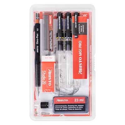 The Aristo ink fountain pen set is ideal for professional work by technical draftsmen, architects, cartographers and artists due to its outstanding quality and functionality The ink @@@+6i13CwZ7odyrf6E2MomKWZKN9JgXItY@@@ have an elaborately chrome-plated tip that is double sealed. It is quick to write on, does not dry out for a long time and ensures even ink flow The pens have a revolutionary refill system without cartridge replacement. The ink can be easily and cleanly refilled via a tank opening. The ink stand is visible at all times The mechanical pencil has an ergonomically grooved grip zone and a metal clip. The spring-loaded metal lead ensures precise drawing. Integrated eraser under the pusher Box contents: AH641540 mg1 Pro ink fountain pen studio set 8 pieces, 3 ink fountain pens mg1 Pro (0.2/0.3/0.5 mm), Geo-Pen fine pencil 0.5 mm with 12 refills, compass adapter, eraser, drawing ink black