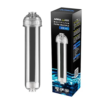 Capacity: approx. 500 ml Ideal for filter material such as mixed bed resin, phosphate absorber, silicate absorber, activated carbon, zeolite, organic pellets and much more. Suitable as an ideal supplement for many standard reverse osmosis systems such as ARKA - Aquatics myAqua190/380 or for connecting to a pump. Box contents: 1 x filter cartridge, 2 x 1/4 inch hose connection, 2 x hose nipples 9/12 mm, 2 x filter sponge, 2 x filter sieves, 2 x wall brackets Dimensions: diameter: approx. 6 cm, height: 32.5 cm