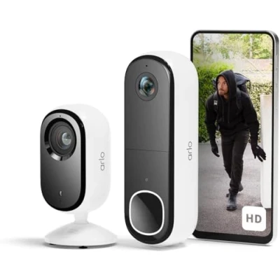 WHAT'S INCLUDED; (1) Indoor 2K Camera (1) Magnetic Mount & Screws (1) Power Adapter (1) HD Video Doorbell (1) Doorbell Mount & Screws (1) USB Magnetic Charging Cable (1) Flat Mounting Plate (1) Quick Start Guide; The unit integrates a dual-standard plug system supporting Type C (Europlug) and Type G (UK) interfaces; utilizing a safety-certified conversion module compliant with UK and EU electrical standards for reliable cross-region operation CRYSTAL CLEAR VIDEO: Capture detailed footage day or night. Essential Indoor Camera offers vivid 2K resolution, ideal for monitoring family or pets, while the HD Video Doorbell provides clear, reliable visuals of visitors at your door both featuring enhanced night vision SMART HOME READY: Seamlessly integrates with Alexa, Google Assistant, and IFTTT. Monitor your home effortlessly through your smartphone, tablet, or smartwatch using Arlo Secure ALL-WEATHER PROTECTION: IP65-rated cameras withstands outdoor elements (0°C to 45°C) and features a built-in siren to alert and deter unwanted guests SEE EVERYTHING CLEARLY: 180° viewing angle and 12x zoom on HD Video Doorbell ensure you won’t miss important details, from package deliveries to visitors. Indoor camera provides expansive 130° view coverage EASY SETUP & WIFI CONNECTIVITY: Quick and effortless installation through the Arlo Secure app, with seamless connection to your home's 2.4 GHz WiFi TRUSTED BY MILLIONS: 2-year warranty backed by Europe's award-winning security brand Arlo, in partnership with Verisure. Protect your home with trusted, reliable technology MOTION DETECTION: Our indoor and outdoor security cameras come with motion detection up to 7m, 2 way audio and livestream with a trial of Arlo's Secure subscription; At Arlo, we keep your data private and secure; Check in on your dog, cat, parcel or even your car via our Arlo Secure Mobile App ARLO SECURE SUBSCRIPTION: Get advanced AI-based motion alerts (people, packages, animals), customized activity zones, cloud storage, and camera theft replacement protection—cancel anytime STORAGE FLEXIBILITY: Enjoy local storage via USB with Arlo Smart Hub (sold separately), protecting your footage from theft, or upgrade to Arlo Secure for cloud backup and advanced security features, Weight: 0.446215618288 pounds, Manufacturer: Arlo