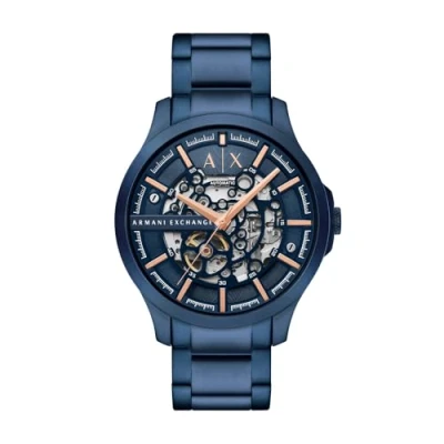 Armani Exchange's 46mm watch features a blue cd finish dial, automatic movement and blue stainless steel bracelet. Case & Movement: 46mm case, 22mm band width, scratch resistant mineral crystal, automatic movement with 3-hand analog display and skeleton dial, imported. Dial: Round stainless steel case, with a blue dial. Watch Band: Blue, stainless steel bracelet; links can be removed for a customized fit. Water Resistant: Up to 50m (165ft); Wearable while swimming in shallow water; 5ATM