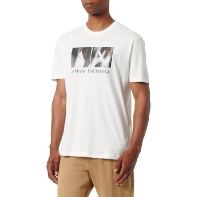 Armani Exchange Men's Classic Ax Box Logo with Camo Background Regular Fit Tee T Shirt, Off White, L