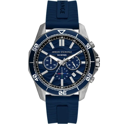 This Armani Exchange Spencer Chronograph Watch for Men is the perfect timepiece to wear or to gift. It's Silver 44 mm Round case combined with the comfortable Blue Silicone watch band will ensure you enjoy this stunning timepiece without any compromise. Operated by a high quality Quartz movement and water resistant to 10 bars, your watch will keep ticking. This classic watch gives a comfortable feeling with its Stainless steel strap, it's perfect for every occasion. This Chronograph watch has a calendar function: Date , Stop Watch , 24-hour Display , Luminous Hands and Luminous Numbers High quality 21 cm length and 21 mm width Blue Silicone strap with a Buckle Case diameter: 44 mm,case thickness: 13 mm, case colour: Silver and dial colour: Blue