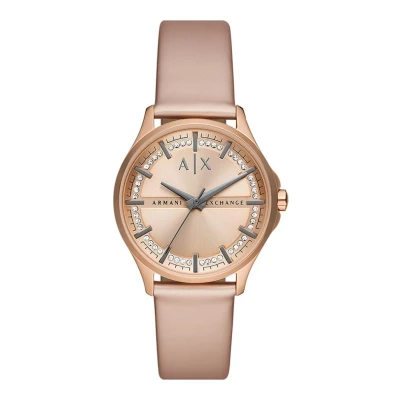 This Armani Exchange Lady Hampton Analogue Watch for Women is the perfect timepiece to wear or to gift. It's Rose Gold 36 mm Round case combined with the comfortable Rose Gold Leather watch band will ensure you enjoy this stunning timepiece without any compromise. Operated by a high quality Quartz movement and water resistant to 5 bars, your watch will keep ticking. Elegant and fashionable watch that is suitable for the daily life of every Women. It’s a great gift for your relatives and friends High quality 19 cm length and 18 mm width Rose Gold Leather strap with a Buckle Case diameter: 36 mm,case thickness: 8 mm, case colour: Rose Gold and dial colour: Rose gold