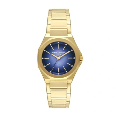 Armani Exchange Watch for Women, Quartz Three Hand Movement and 34 mm Case Size with Stainless Steel or Leather Strap, Gold Tone Blue