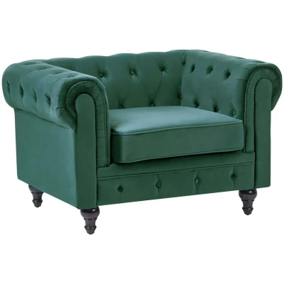 Tufted Upholstered Armchair. Characterised by a sweeping silhouette with wide scroll arms, this armchair comes in an iconic Chesterfield style that suits any modern or traditional interior. The low backrest, as well as soft, thickly padded seat cushions, provides excellent sitting comfort. Upholstered in a gorgeous velvet fabric in a deep shade of green, the seat features classic diamond button tufting. This English classic is easy to care for and looks great with any decor. Details: Product Type: Armchair Style: Glam General Color: Green, Brown Shade: Emerald Green Material Type: Fabric Main Material: Velvet Additional Material: Rubberwood Filling Material: Foam Legs material: Wood Material Composition: 100% Polyester Arm Style: Rolled-Panel Armrests: Yes Leg Caps/ Pads: Yes Pattern: Solid Reclining: No Seat Construction: Sinuous Springs Seat Foam Density: 24 kg/m3 Dimensions: Armrests Height: 70 cm Depth: 75 cm Seat Thickness: 15 cm Seat Height: 45 cm Width: 110 cm Height: 70 cm