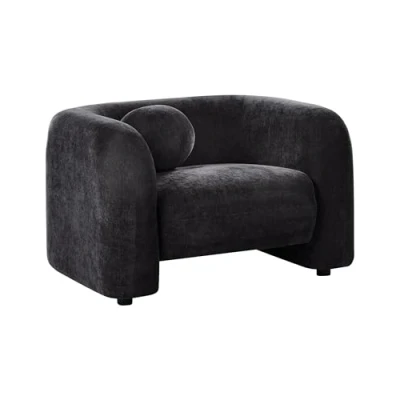 Classic Armchair with Round Throw Cushion. This elegant, glamorous armchair will quickly become your favourite piece in the living room. Crafted in a smooth fabric, it presents a delightfully soft and fluffy appearance, enhancing the room's ambience. Besides being pleasant to touch, the chair is also durable and doesn't require maintenance often. Its thick seat and extra throw pillow, with a removable case, guarantee high comfort when watching TV, hanging out with friends or just relaxing after work. Details: Product Type: Armchair Style: Modern General Color: Black Material Type: Fabric Main Material: Chenille Additional Material: Rubberwood Filling Material: Foam Legs material: Wood Seat Material: Fabric Material Composition: 100% Polyester Arm Style: Track Armrests: Yes Leg Caps/ Pads: No Pattern: Solid Reclining: No Seat Construction: Sinuous Springs Seat Foam Density: 24 kg/m3 Dimensions: Armrests Height: 63 cm Depth: 87 cm Seat Thickness: 35 cm Seat Height: 46 cm Width: 113 cm