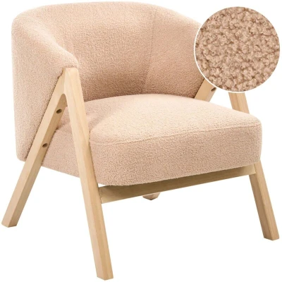 Modern Upholstered Accent Chair with Wooden Legs. Elevate your living space with this modern accent chair, boasting a plush, beige bouclé upholstery that exudes sophistication and comfort. The chair's distinctive wooden frame, crafted from warm rubberwood, not only provides sturdy support but also adds a touch of timeless elegance. Perfect for creating a cosy reading nook or complementing your chic decor, this piece offers you to unwind in style. Details: Product Type: Armchair Style: Minimalist General Color: Beige, Brown Material Type: Fabric Main Material: Boucle Additional Material: Rubberwood Filling Material: Foam Legs material: Wood Seat Material: Fabric Material Composition: 100% Polyester Arm Style: Flared Armrests: Yes Leg Caps/ Pads: No Pattern: Solid Reclining: No Seat Construction: Plywood Seat Foam Density: 28 kg/m3 Dimensions: Armrests Height: 69 cm Depth: 66 cm Seat Thickness: 16 cm Seat Height: 44 cm Width: 67 cm Height: 69 cm Seating Surface: 60x55 cm Weight: 13 kg