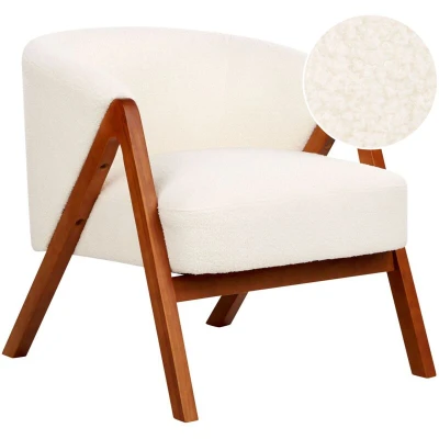 General description Elevate your living space with the Armchair SKEI Boucle White, a modern upholstered accent chair featuring plush, off-white bouclé upholstery that exudes sophistication and comfort. The chair's distinctive wooden frame, crafted from warm rubberwood, provides sturdy support while adding a touch of timeless elegance. Perfect for creating a cozy reading nook or complementing your chic decor, this piece allows you to unwind in style. Technical specifications Product Type: Armchair Style: Traditional General Color: White, Brown Shade: Off-White Main Material: Boucle Additional Material: Plywood Filling Material: Foam Legs Material: Wood Material Composition: 100% Polyester Arm Style: Flared Armrests: Yes No Pattern: Solid Reclining: No Seat Construction: Wood Seat Foam Density: 28 kg/m3 Dimensions: Armrests Height: 69 cm, Depth: 66 cm, Seat Thickness: 16 cm, Seat Height: 44 cm, Width: 67 cm, Height: 69 cm, Seating Surface: 60x55 cm Weight: 13 kg Weight Capacity: 150 kg