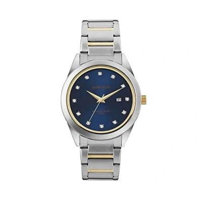 Mineral crystal lens Navy blue sunray dial with date calendar window; gold-tone hands and clear genuine crystal markers Silver-tone adjustable link bracelet; fold over clasp with double push-button safety Water resistant to 165 feet (50M)