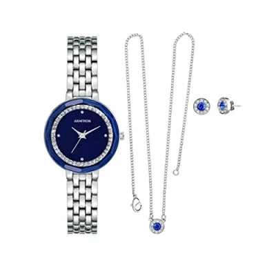 Wall-to-wall facetted mineral crystal lens; outer ring set with 44 clear genuine crystals Sapphire blue sunray dial with silver-tone hands and genuine crystal markers Silver-tone adjustable link bracelet; jewelry clasp and extender Set includes: one necklace and one pair of earrings with sapphire and clear genuine crystals Not water resistant