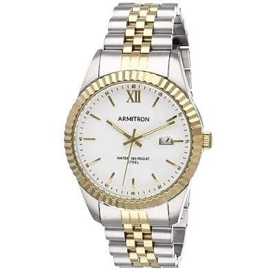 Coin edge bezel; mineral crystal lens Glossy white dial with date calendar window; gold-tone luminous hands and markers; black outer minute track Two-tone adjustable link bracelet; fold over clasp with double push-button safety Water resistant to 165 feet (50M)