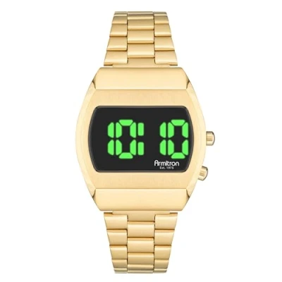 Gold-tone organic shaped case LED display with green digits activated by side button Functions include: time, seconds, date, month, year and military time Gold-tone link bracelet with adjustable sliding buckle closure Water resistant to 165 feet (50M)