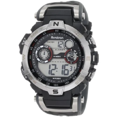 Two-tone digital watch with multiple dial displays, compass-inspired bezel, and textured pusher Features lap timer, countdown timer, military time, hourly charm, chronograph subdials, LCD screen 44 mm resin case with acrylic dial window Japanese quartz movement with digital display Resin band with buckle closure