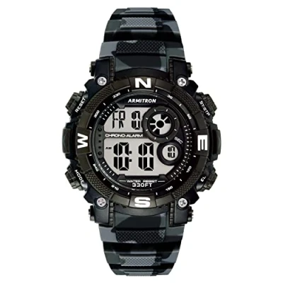 Black resin case and top ring LCD display with time, seconds, day and date Functions include: chronograph, lap time, alarm, dual time, military time and backlight Black camouflage patterned resin strap with buckle closure Water resistant to 330 feet (100M)