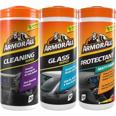 Armor All Triple Canister Pack contains Armor All Stain Remover Multi-Purpose Wipes, Armor All Protectant Matte Wipes 30ct and Armor All Glass Wipes 30ct Cleans & Restores: These car cleaning wipes help to remove grime, tough road dirt, insects and stains to protect car surfaces and keep your car interior looking its best for long-lasting results Multi-Surface Use: Three-in-one car cleaning solution with wipes for dashboard, windows and soft trims to provide quick and easy car care Plastic-Free Wipes: Quick clean wipes made with biodegradable plant material Quick and Easy Car Care: One easy clean wipe can treat an entire dashboard or windscreen – with no mess on your hands Long Lasting: The interior car care wipes are moisture sealed for freshness Trusted Car Care: Get innovative, easy-to-use cleaning and protecting solutions from Armor All