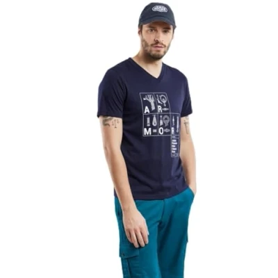Armor Lux Men's V Neck T Shirt Screen Printed, Nomenclature/Marine Deep, S