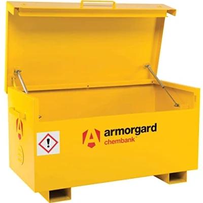 General description This Armorgard ChemBank™ Site Box is designed for the safe storage of chemicals, making it ideal for external fixed applications where security is a concern. It features a fully welded and tested sump base to prevent leakage and is equipped with both high and low-level ventilation to avoid the build-up of fumes. The box is finished in bright yellow and comes with relevant hazard warning signs as standard. Technical specifications External Dimensions: 1275 x 665 x 660mm Internal Dimensions: 1185 x 600 x 575mm Weight: 86kg Fire resistance: 30 minutes Other information Fitted with flame arrester gauze Equipped with ultra-robust 5-lever deadlocks with anti-drill plates and anti-cut rollers in the deadbolt Supplied with robust chubb style keys