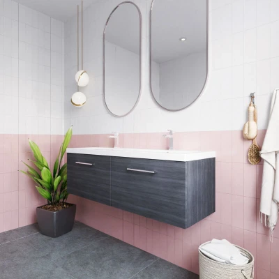General description The Nuie Arno Anthracite Woodgrain 1200mm Wall Hung 2 Drawer Vanity Unit with Double Ceramic Basins is a perfect blend of style and functionality, designed for modern bathrooms. With its striking anthracite woodgrain finish, this vanity unit brings a touch of sophistication while ensuring durability. The double ceramic basins offer ample space for daily routines, making it ideal for families or shared bathrooms. Each basin features two tap holes, allowing for the installation of stylish mono basin mixer taps, enhancing both convenience and elegance. Equipped with two soft-close drawers, the vanity unit provides ample storage for toiletries and bathroom essentials, helping to keep your space organized and clutter-free. This unit is not only practical but also an eye-catching focal point for your bathroom. Technical specifications Model Number: ARN522F Dimensions of Double Ceramic Basin: W:1205mm x H:390mm x D:175mm Dimensions of Vanity Unit: W:600mm x H:359mm x