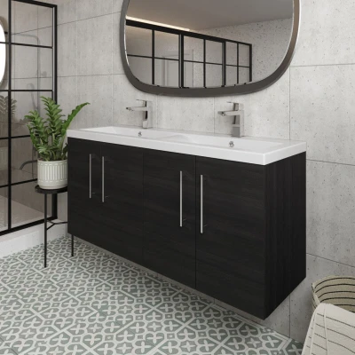 Arno Charcoal Black Woodgrain 1200mm Wall Hung 4 Door Vanity Unit with Double Ceramic Basins ARN623F Nuie