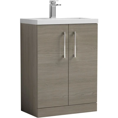 Arno Compact Floor Standing 2 Door Vanity Unit with Ceramic Basin 600mm Wide Solace Oak Woodgrain Nuie