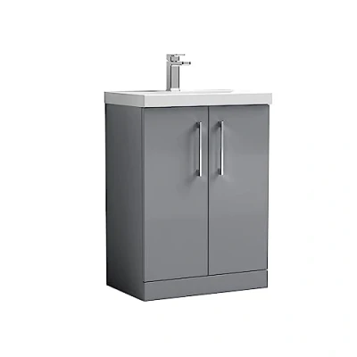 General description The Nuie Arno Satin Grey 600mm 2 Door Vanity Unit and Thin Edge Ceramic Basin is a stunning addition to any modern bathroom. With its sleek satin grey finish and contemporary design, this vanity unit enhances your bathroom's aesthetic while offering practical storage solutions. The spacious two-door cabinet features a soft close mechanism for quiet operation and added durability. The included thin edge ceramic basin is stylishly proportioned for everyday use, making it an ideal choice for those who appreciate both form and function. Technical specifications Model Number: ARN2203D Vanity Unit Dimensions: W:600mm x H:800mm x D:383mm Basin Dimensions: W:610mm x H:170mm x D:395mm Compatibility and accessories 1 tap hole for mono basin mixer tap Basin tap and waste sold separately unless specified Other information Constructed from high-quality MDF for longevity and robustness Floor-standing design for easy access and stability Modern D-shaped handles for added elegance