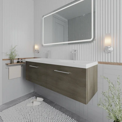 General description This stylish Nuie Arno Solace Oak Woodgrain 1200mm Wall Hung 2 Drawer Vanity Unit with Double Ceramic Basins is a perfect fusion of modern aesthetics and functional design. The stunning oak woodgrain finish adds warmth and contemporary elegance to your bathroom. With two spacious drawers, it provides ample storage for your bathroom essentials, keeping your space tidy and organized. The dual ceramic basins offer a practical solution for shared bathrooms, making morning routines effortless and efficient. Crafted from high-quality MDF, the vanity unit ensures durability while maintaining a lightweight structure. The soft-close mechanism on the drawers guarantees a gentle closure, preventing slamming and enhancing longevity. Designed with a sleek D-shaped handle, it combines form and function seamlessly, making it easy to access your stored items. Technical specifications Model Number: ARN2522F Dimensions of Double Ceramic Basin: W:1205mm x H:390mm x D:175mm Dimensions