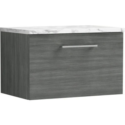 Arno Wall Hung 1 Drawer Vanity Unit with Carrera Marble Worktop 600mm Wide Anthracite Woodgrain Nuie