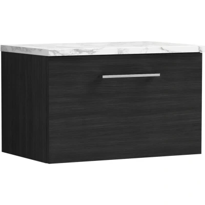 Arno Wall Hung 1 Drawer Vanity Unit with Carrera Marble Worktop 600mm Wide Charcoal Black Woodgrain Nuie
