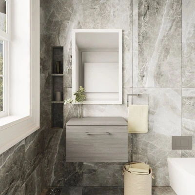 General description Now available in a number of trendy woodgrain finishes, the Nuie Arno Wall Hung 1-Drawer Vanity Unit with Worktop offers a stylish and modern design that can be highly customized to suit your bathroom needs. With multiple cabinet finishes, countertops, handles, and vessel basins available, you can create your dream bathroom with ease. Technical specifications Total Height (Unit + Countertop): 377mm Total Width (Unit + Countertop): 605mm Total Depth (Unit + Countertop): 390mm Unit Height: 359mm Unit Width: 600mm Unit Depth: 383mm Countertop Thickness/Height: 18mm Weight: 15.50kg Compatibility and accessories Compatible with matching tall units, WC units, mirror cabinets, and bath panels within the Arno collection. Alternative handle designs and finishes are available separately as optional extras. Installation Vanity unit supplied rigid - no assembly required on the carcass/cabinet. Unit includes pre-drilled blind holes for installation of handles (supplied loose).