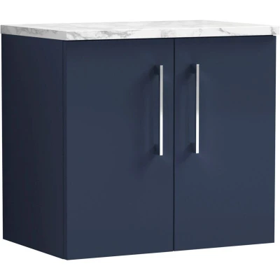Arno Wall Hung 2 Door Vanity Unit with Carrera Marble Worktop 600mm Wide Midnight Blue Nuie