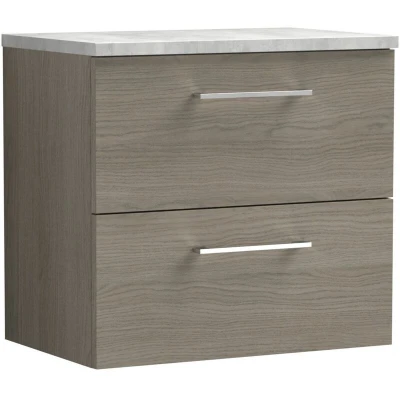 Arno Wall Hung 2 Drawer Vanity Unit with Bellato Grey Worktop 600mm Wide Solace Oak Woodgrain Nuie
