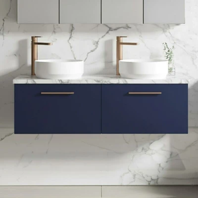 Arno Wall Hung 2 Drawer Vanity Unit with Carrera Marble Worktop 1200mm Wide Midnight Blue Nuie