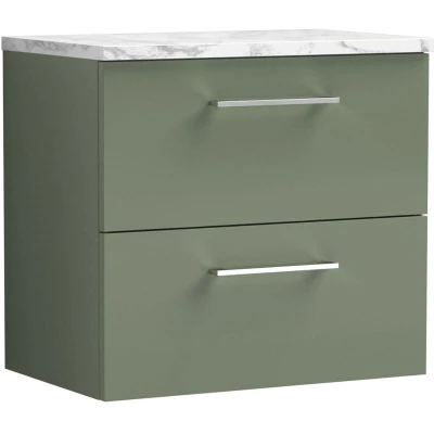 Arno Wall Hung 2 Drawer Vanity Unit with Carrera Marble Worktop 600mm Wide Satin Green Nuie