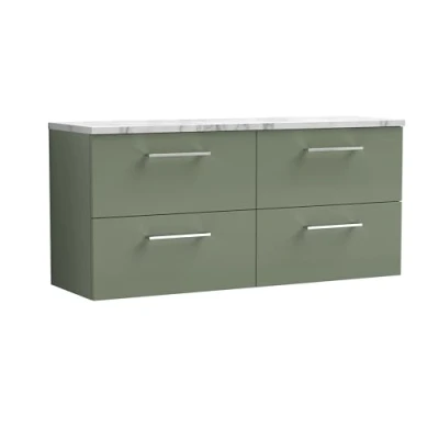 Arno Wall Hung 4 Drawer Vanity Unit with Carrera Marble Worktop 1200mm Wide Satin Green Nuie