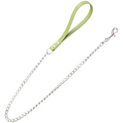 Strap iron chrome walking Q195 (page committed to environmental protection) and with colour leather riveted handle Ideal for walks with your pet strap strong and ideal for dogs who have habit mordisquear the straps Made in Spain of High Quality Materials durable, available in different sizes and colors. Clip the carabineer peg to the collar, harness or Petral and make sure to hold the handle of safely control the state of the product before use regularly for added security. Leather, Metal